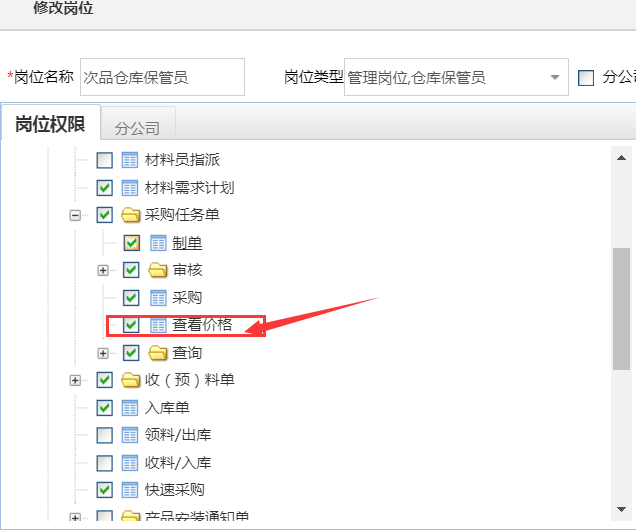 首先通過系統設置---部門/用戶---崗位管理---材料管理---采購任務單--查看價格勾選
