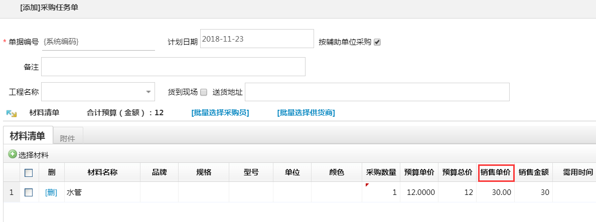 根據客戶反饋的需求,采購任務單下單的環節中將材料的銷售價可直接顯示出來供采購員參考。這樣不僅僅只是查看材料成本價也能查看材料銷售價,給采購人員更多的參考價格。