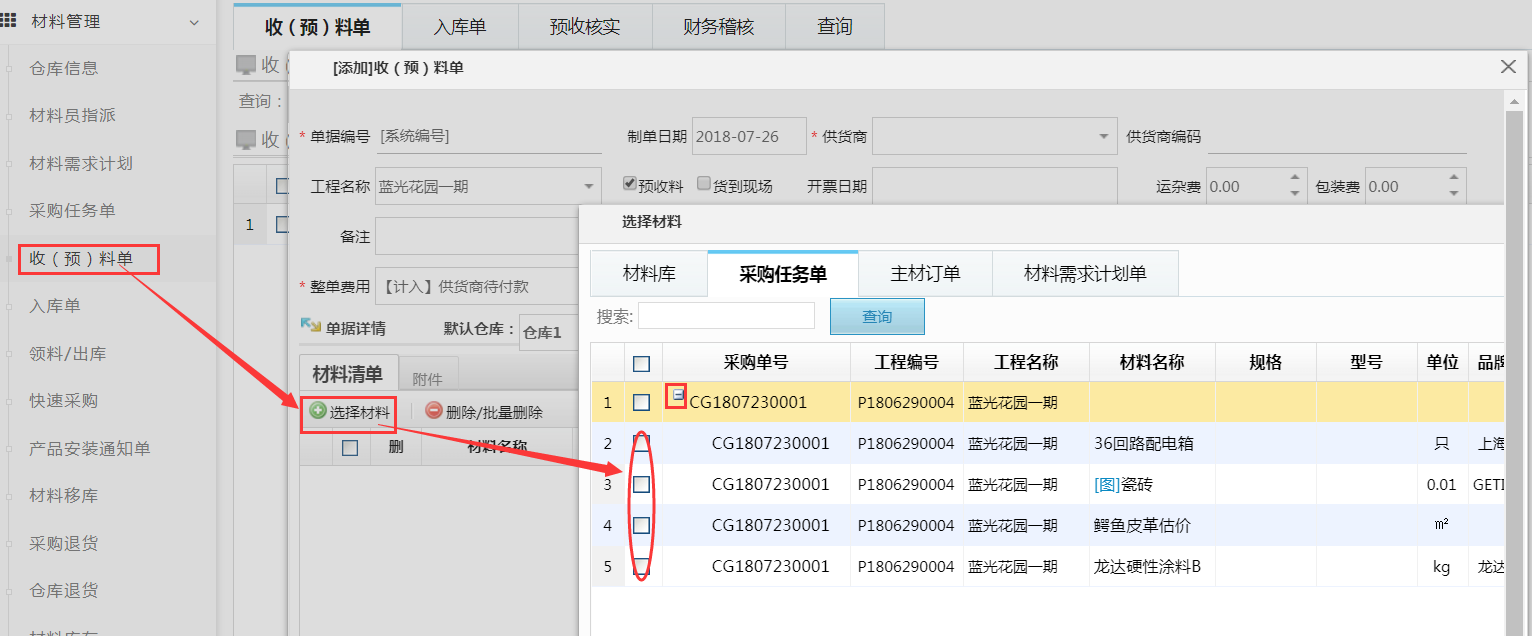 依次點擊:材料管理---收預料單---添加材料(采購任務單)